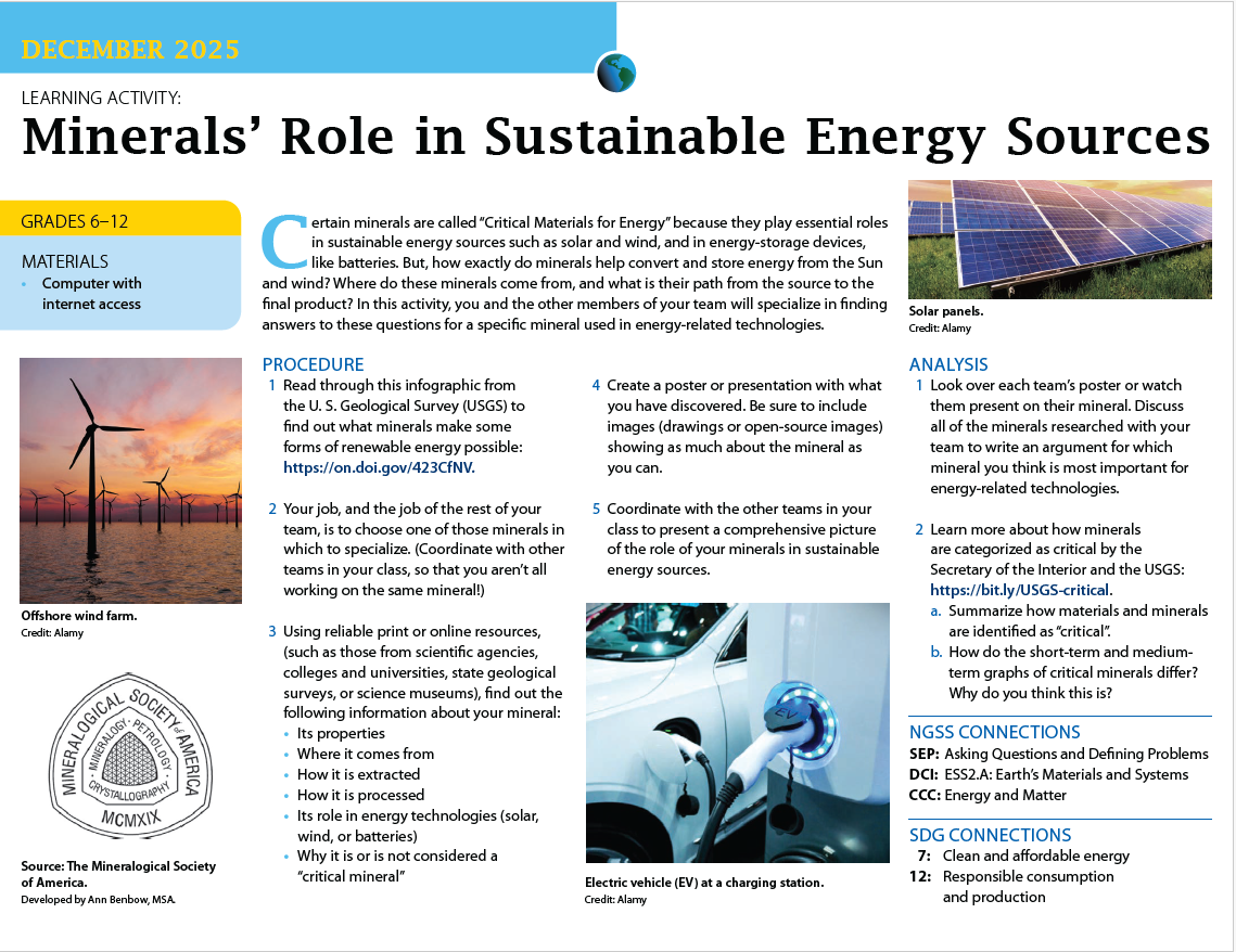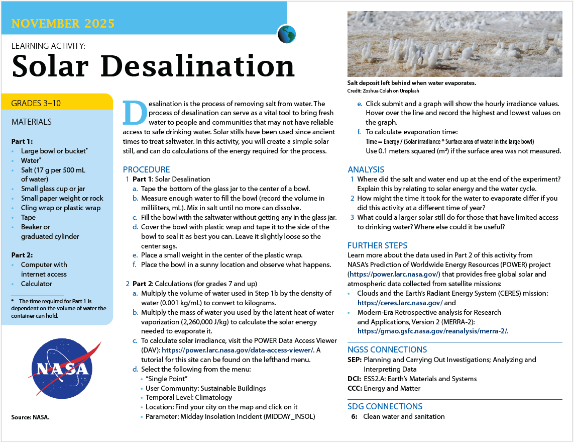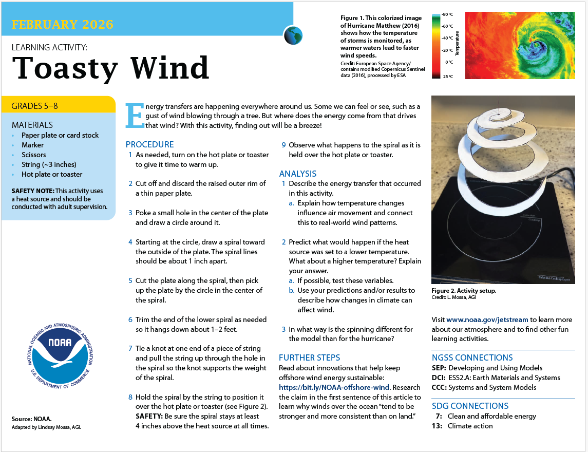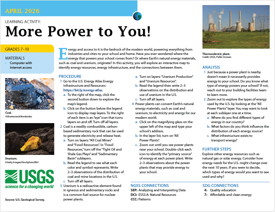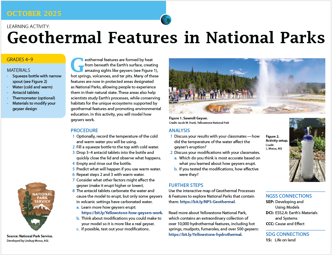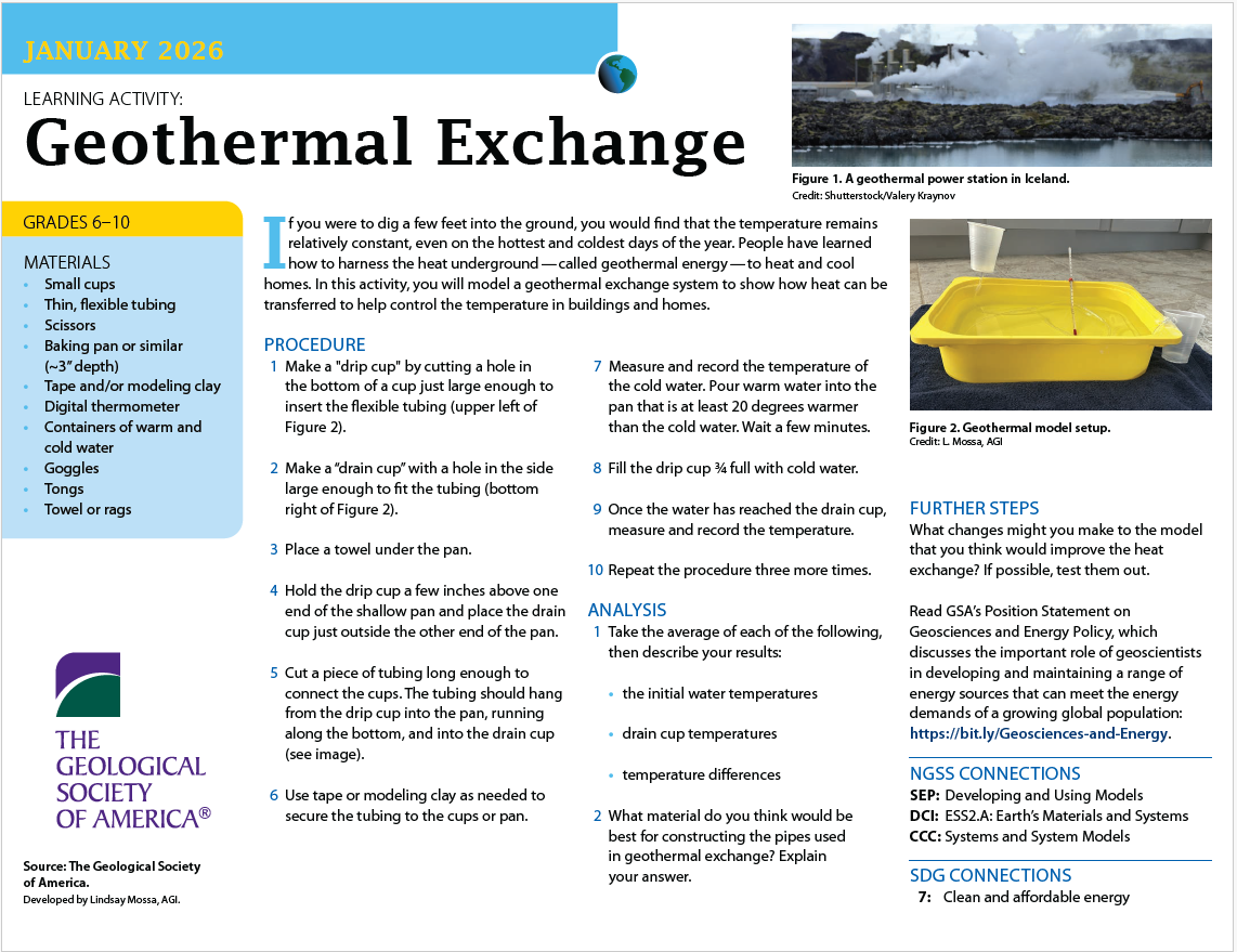 The Earth Science Week Activity Calendar extends the celebration from one week to the whole school year! Distributed as part of the Earth Science Week Toolkit, this attractive wall calendar features an exciting classroom activity each month.